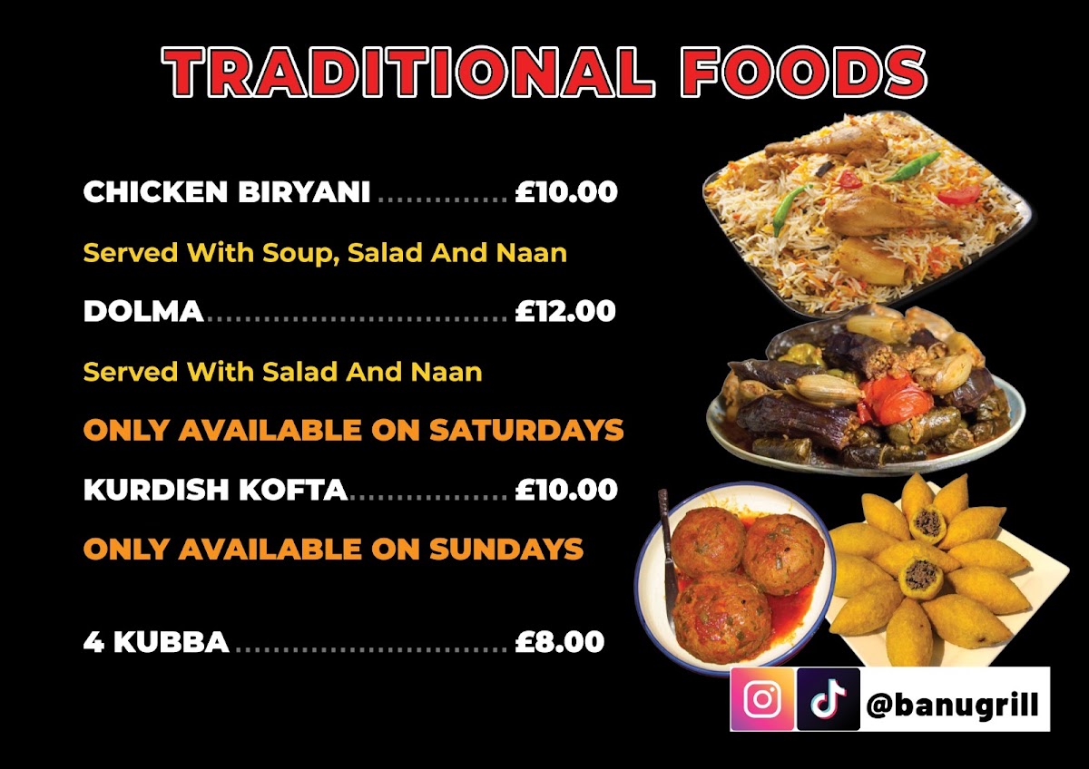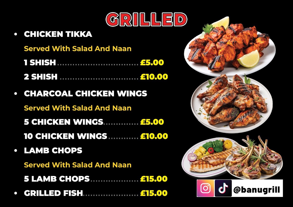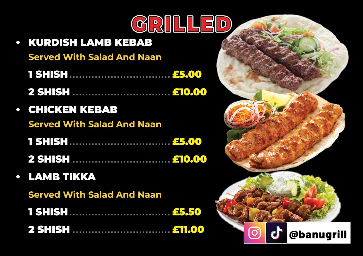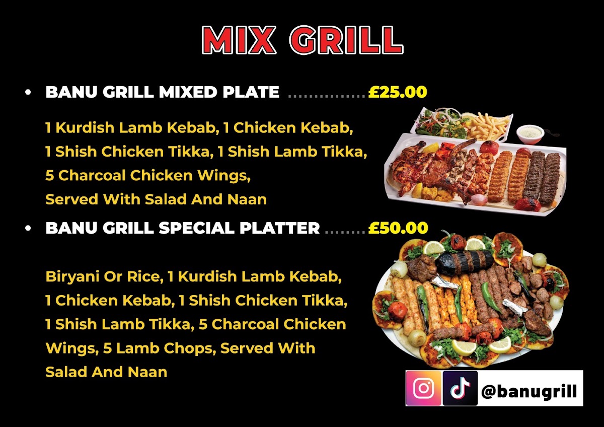 Welcome to Banu Grill, a premier dining destination at 100 Colne Rd, Burnley. This restaurant offers a rich array of Kurdish and Middle Eastern cuisine that captivates the palate. The standout item, the Banu Grill Mixed Plate, features a delicious combination of Kurdish lamb kebabs, chicken tikka, and mouth-watering charcoal chicken wings, all beautifully presented with warm naan and crisp salad. For those seeking a heartier experience, their mixed platter includes biryani or rice, alongside succulent lamb chops.